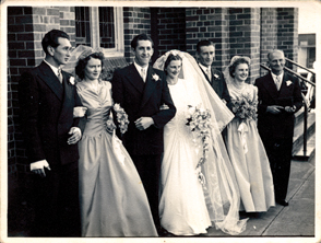DESCRIPTIONThis image shows a wedding party standing outside a brick building posing for a photo. The bride and groom are in the centre and a bridesmaid and bestman/groomsman are on either side. The brides father on on the far right-hand side of the group.