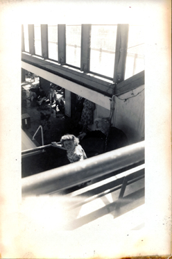 DESCRIPTIONThis image shows a young girl and an elderly woman holding onto a rail and looking up at the camera. People are sitting and standing on the floor below them and a wall of windows are above. A rail is in the foreground.