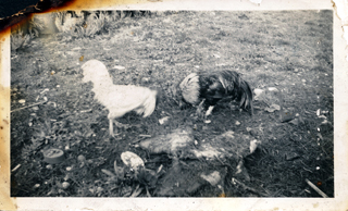 DESCRIPTIONThis image shows two roosters, one white and one multi coloured, facing one another. Food scraps appear to be on the grass all around them. The top left-hand corner of the photograph has been burnt.