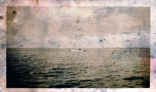 DESCRIPTIONThis badly marked sepia image shows a boat/yacht at the centre of a large expanse of water.
