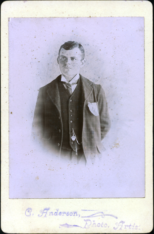 DESCRIPTIONThis portrait shows a young man, taken from the waist up. He is dressed in a three piece check suit, white shirt and striped tie. His hair is neatly parted on the left side. He has a watch and chain attached to his waistcoat and a handkerchief hanging out of his left coat pocket. He is looking away from the camera. Printed on the mounting at the bottom is: “C. Anderson, Photo Artist”.