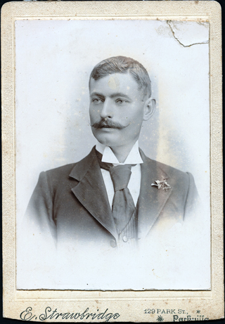 DESCRIPTIONThis portrait shows a young man, taken from the chest up. He is dressed in a three piece suit, white shirt and tie. His hair is neatly parted on the left side. He has a flower in his coat lapel. He has a large moustache and he looking away from the camera. The photographer’s details are printed on the bottom of the mounting - ‘E. Strawbridge 129 Park St., Parkville’.