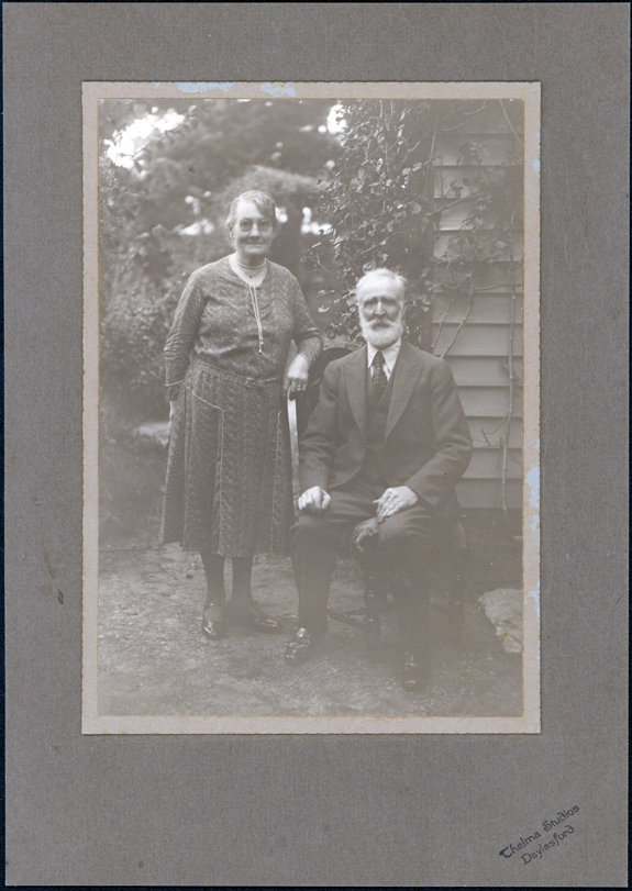 DESCRIPTIONThis portrait shows an elderly man sitting on a dining-room chair and a woman standing beside him, her right arm resting on the chair, posing for a professional photograph. The woman is wearing a knee-length, long sleeved dress with a belt at the waist. She has a string of pears tied around her neck. The man is dressed in a three-piece suit, white shirt and tie. Part of a weatherboard house and trees and shrubs can be seen behind them. The photographers details are printed on the mounting.