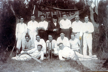 DESCRIPTIONThis image shows a cricket team standing, sitting and lying, posing for a photo. There are seven men standing in the back row, five men squatting in the middle row and two men half-lying on the grass at the front. An elderly man, dressed in a three piece suit and hat, is in the middle of the back row. Cricket stumps are in the ground between the two front players. They both have a cricket bat lying across their body. The two men on either end of the back row are holding a cricket bat. A banner with ?.C.A. Premiers is behind the group. Trees are in the background.