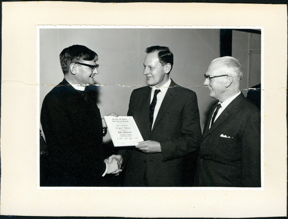 DESCRIPTIONThis image shows three men dressed in suits. The two men on the left are shaking hands and holding a document which reads: “Hastings and District Bush Nursing Hospital This is to certify that Dr John F. Williams was elected a Life Governor of Hastings and District Bush Nursing Hospital on 7th day of June 1968”. A grey-haired man on the right-hand side is watching the presentation.