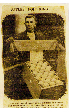 DESCRIPTIONThis image shows a man standing behind a large box of apples. He is holding the top of a display board that is backing the box. Printed across the top of the photo is: “APPLES FOR KING”. PRINTED ACROSS THE BOTTOM OF THE PHOTO IS: “THE BEST CASE OF EXPERT APPLES EXHIBITED AT THE FRUIT AND FLOWER SHOW AT THE TOWN HALL, WHICH WILL be sent to His Majesty the King. The exhibitor was.......”