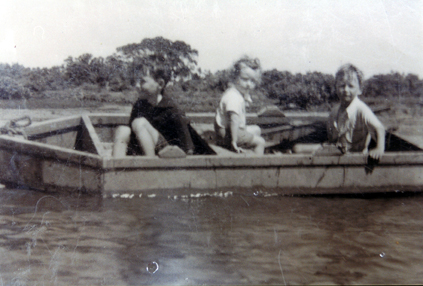 DESCRIPTIONThis image shows three small children in a boat close to the shoreline. Trees and shrubs are in the background. The two boys in the light coloured shirts are looking at the camera. The boy on the left, in the dark coloured long-sleeved shirt is looking away.