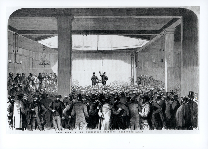 DESCRIPTIONThis is a photograph of a sketch. The backs and the heads of a large number of men are facing the front where two men are standing conducting a sale. The building has large pillars and light pendants are hanging from the ceiling. Printed across the bottom of the image is: “Land Sale in the Exhibition Building Melbourne. - See Page 7”.