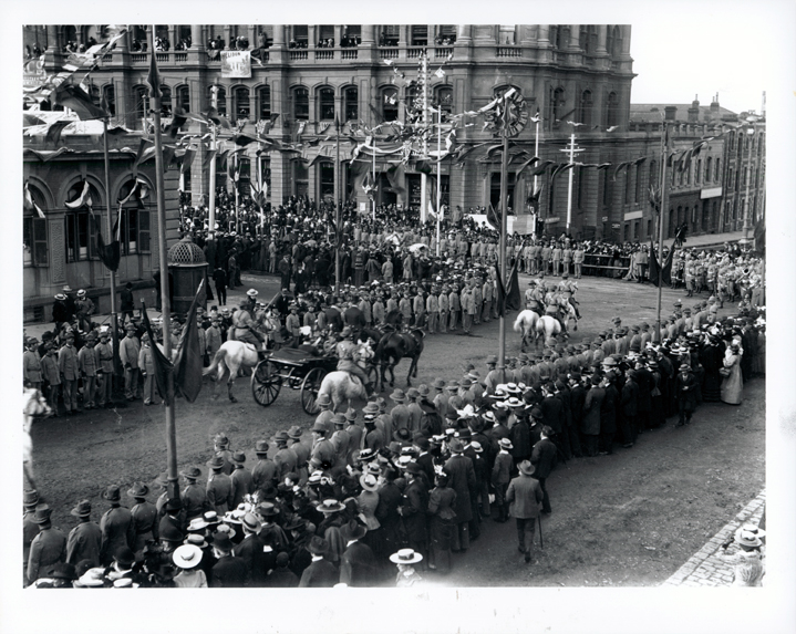 DESCRIPTIONThis image shows a street parade. The streets are lined with military men and the public behind them. People are also on the verandahs and windows of the buildings. Soldiers on white horses are escorting a carriage drawn by two black horses. Flags decorate the streets and buildings.