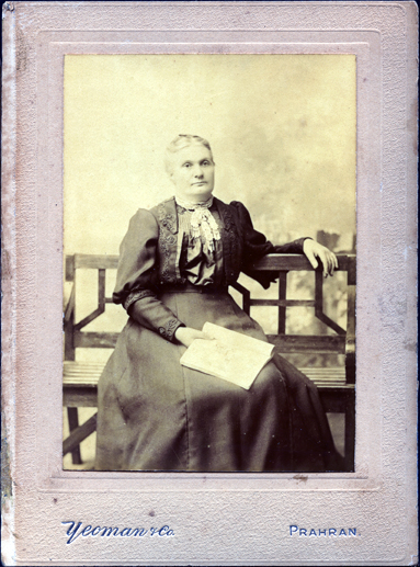 DESCRIPTIONThis image shows a woman sitting on a wooden bench seat. She is holding a book in her right hand and her left arm is draped over the back of the chair. She has a plain skirt and an embroiled jacket. Lace is tied at the high neck line. Her hair has a center part and is pulled back severely. Printed in silver across the bottom of the mounting board is: “Yeoman & Co.” and ‘Prahran’.