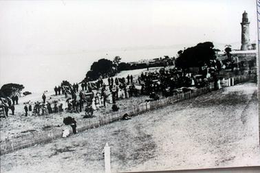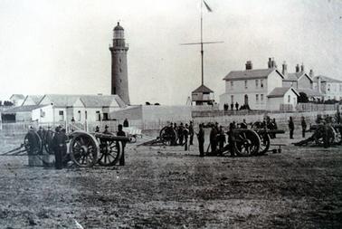DESCRIPTIONThese four photographs show several field carriages with guns, spread across open ground, with service men standing to attention beside them. Buildings, a lighthouse, tall flagpole and a large group of people behind a wooden fence can be seen.