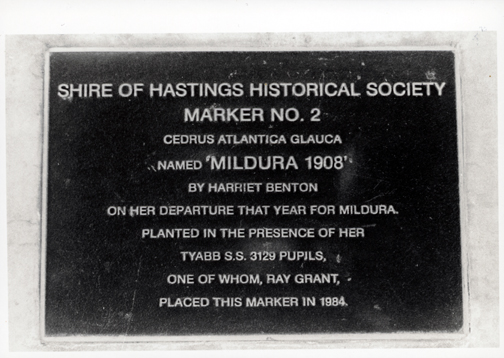 This image shows a metal plaque attached to stone. The plaque reads: “Shire of Hastings Historical Society Marker No. 2 Cedrus Atlantica Glauca named “MILDURA 1908’ by Harriet Benton on her departure that year for Mildura. Planted in the presence of her Tyabb S.S. 3129 pupils, one of whom, Ray Grant, placed this marker in 1984.”