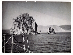 DESCRIPTIONThis image shows a seascape which features a very large rock and a smaller one to its right. Water surrounds the rocks and hills can be seen in the distance. Poles and chains are in the foreground on the far left-hand side of the image.