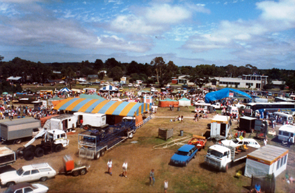DESCRIPTIONThese aerial photos show a town, vacant land in the foreground, a jetty, harbour, boats and a festival with tents, caravans, trucks and a crowd of people.
