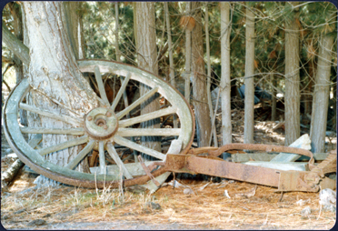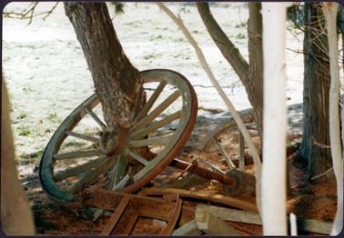 DESCRIPTIONThese three images shows two wagon wheels underneath cypress trees. A tree trunk has grown up through the spokes of one wheel. The other wheel lies broken and pieces of a wagon lie on the ground.