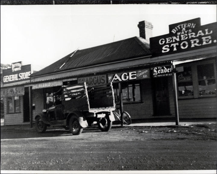 DESCRIPTIONThis image shows a shop front covered in signage. The section in the middle has a brick frontage and the two sections on either side are timber. Windows and doors are across the front. Four verandah posts are along the footpath and an old delivery truck is parked beside the shop. A bicycle is leaning against a post beside the truck. Signs across the front of the shop read as follows: “Bittern 5 Ways General Store, The Sun, The Herald, Globe, Read Argus, The Age, Classified Ads, and The Leader The Popular Weekly”. A gravel street is in the foreground.