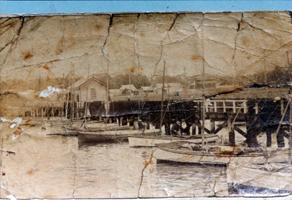 DESCRIPTIONThis cracked and faded image shows a jetty with fishing boats lined up along the side, looking back to the town. Fishing nets are hung over the rail of the jetty. A small shed is on the jetty and buildings can be seen on the land.