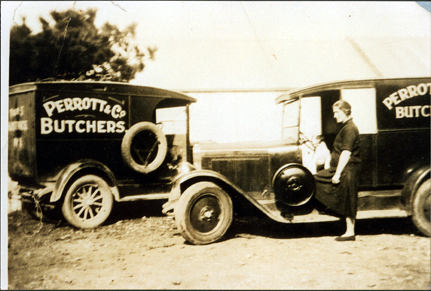 DESCRIPTIONThis image shows two vans parked facing each other. They have ‘Perrott & Co Butchers’ painted in white on their vans. Both vehicles have running boards and no doors. The van on the left has wooden spokes on the wheels. Both vans have spare tyres attached to their sides. A woman, dressed in black, is standing beside the van on the right. She has one foot on the running board.