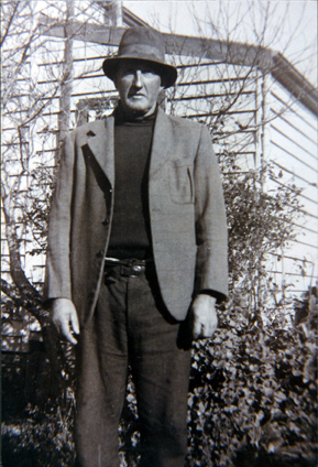DESCRIPTIONThis image shows a man standing in front of a timber house, posing for a photo. He is wearing dark coloured trousers and pullover with a lighter coloured sports coat. His hat is shading his eyes and he has a serious look on his face.