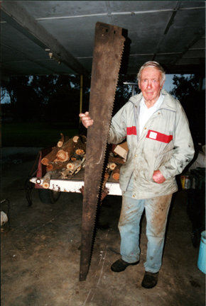 HISTORYThis man is Bill Jones from Moorooduc. He is holding the ‘Absalom’ pitsaw. The photographs were taken by Barbara Male and donated by Bill Jones.