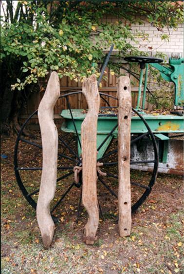 DESCRIPTIONThe first image shows a man standing in an open shed, posing for a photo. He is holding a large pitsaw in his right hand. He has grey hair and is wearing a dirty jacket and trousers. A trailer with several logs on the tray can be seen behind the man. The second image shows the three pieces of a bullock yoke leaning against the wheel of a green machine. A timber fence is in the background and a brick wall is behind the fence.