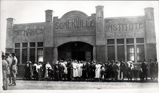 DESCRIPTIONApproximately fifty people are standing in front of the Somerville Mechanics Institute. The crowd consists of men, women, children, soldiers and nurses. The building has an imposing front consisting of four very tall pillars. The bottom half is brick and the top section is concrete. Large sets of windows are on either side of the imposing entry and front doors.