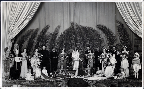 DESCRIPTIONThis image shows a group of twenty-four men, women and children standing and sitting in a theatre. The women are dressed in long formal dressed with crowns on their heads and large bouquets of flowers. The woman at the centre of the group is holding a sceptre. One man is dressed as a judge, another is in a suit and the remainder of the men are dressed as ministers of the church. A pageboy is holding a cushion on the far right-hand side. Large palm fronds are standing behind the group as well on the floor at the front. Large curtains are at the back and sides of the theatre.