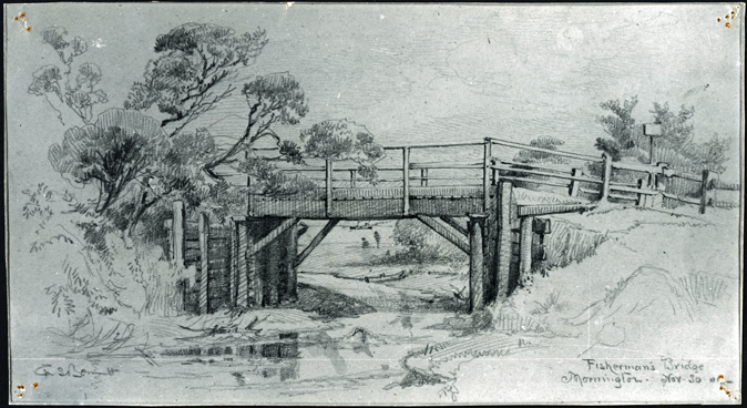 DESCRIPTIONCopy of a pencil sketch of Fisherman’s Bridge depicting a wooden bridge over a small creek. There are wooden railings on either side of the bridge and the road leading towards the bridge. Left side shows dense vegetation while the other side is cleared