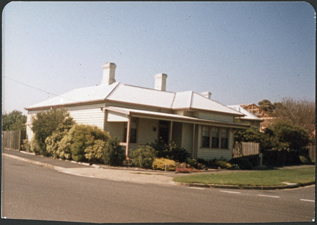 DESCRIPTIONA white weather board residence with three chimneys and a part verandah