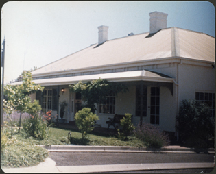 DESCRIPTIONA side on view of a white brick residence with sloping iron roof and two chimneys; there is a bullnosed a verandah along the front of the house.