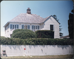 DESCRIPTIONA white shingle two story Cape Cod house one chimney, window shutters, picket fence, hedge at front