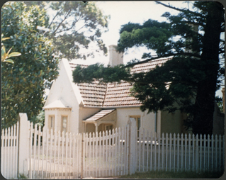 DESCRIPTIONThis house is of a side/front view, made of stucco brick with a tiled roof, bay window and small porch pine tree at right hand side of the house with picket fence and gate