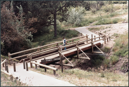 DESCRIPTIONThis image is of the new wooden bridge with timber railing across Tanti Creek, with the "Stones Crossing" sign erected