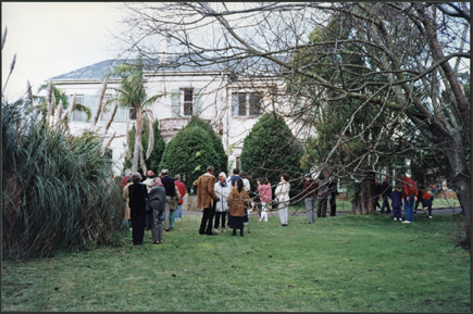 The image shows a two storied stuccoed mansion with portico, mature plantings in the front garden