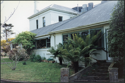 The image shows a two storey stuccoed section of the building with chimney, single storey, split roof level, cement sheet (1940s addition?), steps to door and a part view of garden