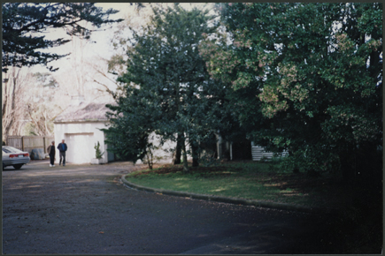 A view through the garden with mature trees to the garage which is single storey, one section with door and centre open, winding driveway