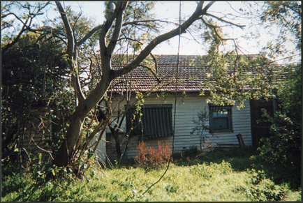 A rear view of a c 1920s weather board cottage with an unkempt garden