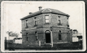 A two storey corner brick building five upper windows four lower windows and doorway on corner with arches two chimneys fence and street lamp in front smaller buildings to left and right altered over time