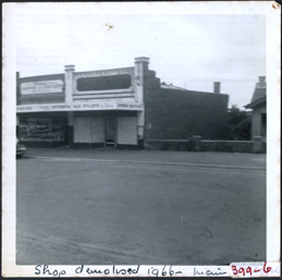 DESCRIPTIONTwo shops with parapets with square rises at each end, house next door on right, shops demolished in 1966
