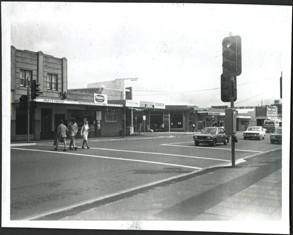 DESCRIPTIONThree pedestrians on crossing two cars on road, one car parked, two story building on left one shop "Jikkys Frocks"