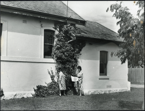 DESCRIPTIONThe image shows Leslie Moorhead and Joan Bognuda standing at the side of Mornington Court House
