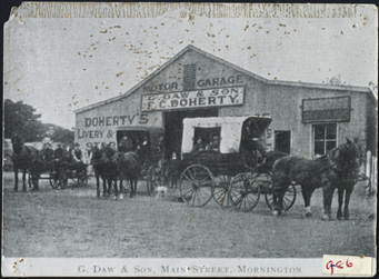 The tin shed is ‘Doherty's Livery and Stables’, also held ‘G. Daw and Sons Motor Garage’ in front of the shed