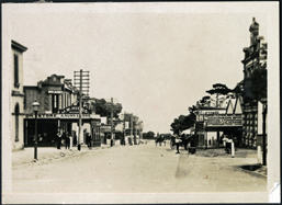 DESCRIPTIONA view of Main Street, Mornington looking north showing telegraph poles on west side of street also gas street light Nunns Store on the left and Bank on the right