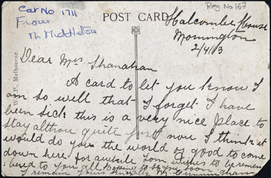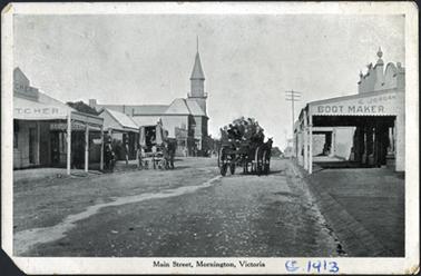 DESCRIPTIONView of Main Street, Mornington looking down the road towards the Grand Hotel various shops with verandahs are situated both sides of the street a cart with a load of men drawn by a horse is heading south a covered wagon is situated on the other side of the street