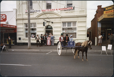 DESCRIPTIONView in Main Street, Mornington. The image is of a horse and carriage with one woman and two men dressed in Victorian costumes in front of the National Bank. A group of people in Victorian costumes are standing in the doorway of the National Bank. A poster advertising ‘National Bank 100 Years in Mornington’ is on the National Bank building. This image was taken in 1988 on Australia Day