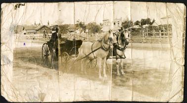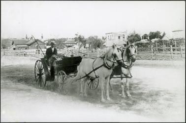 DESCRIPTIONA view of a carriage and two horses on the Esplanade, Mornington, on wooden fence behind, reads