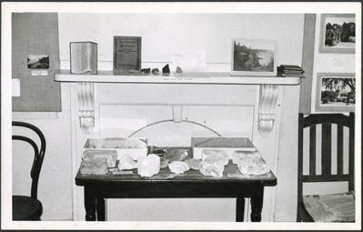DESCRIPTIONA view of the historical society museum display in 1970 showing the fireplace with a wooden table placed in front displaying minerals or fossils