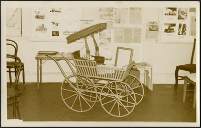 DESCRIPTIONA view of the historical society museum display in 1970 showing an American heritage pram with the hood open doll sitting in the pram