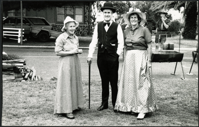 DESCRIPTIONFrom left, B. Grice, N. Taylor and J. Unsworth, wearing old-style clothing, at the Picnic in the Mornington Park