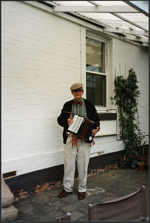 DESCRIPTIONPhoto of Mac David son Vice President, at the Garden Party standing in front of window at The Vicarage Ross St. November 1994, holding an accordion